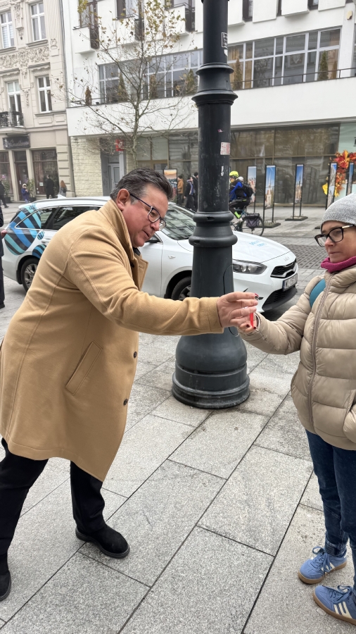 "Szanowni Państwo, jesteśmy dokładnie w przededniu rocznicy odzyskania przez Polskę niepodległości. Bardzo ważne święto, święto wszystkich obywateli, bez względu na to, czy są zwolennikami lewicy, prawicy, święto nas wszystkich. Dlatego dzisiaj z okazji tego święta będziemy rozdawać mieszkańcom Łodzi kotyliony, żeby jutro dumnie ten kotylion przyczepili sobie do kurtki, do marynarki, do swetra i dumnie pokazywali, że Polska jest niepodległym krajem". - mówił Tomasz Trela, Poseł Na Sejm RP.