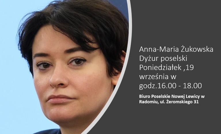 Posłanka na Sejm RP Anna Maria Żukowska zaprasza na dyżur poselski, któ...