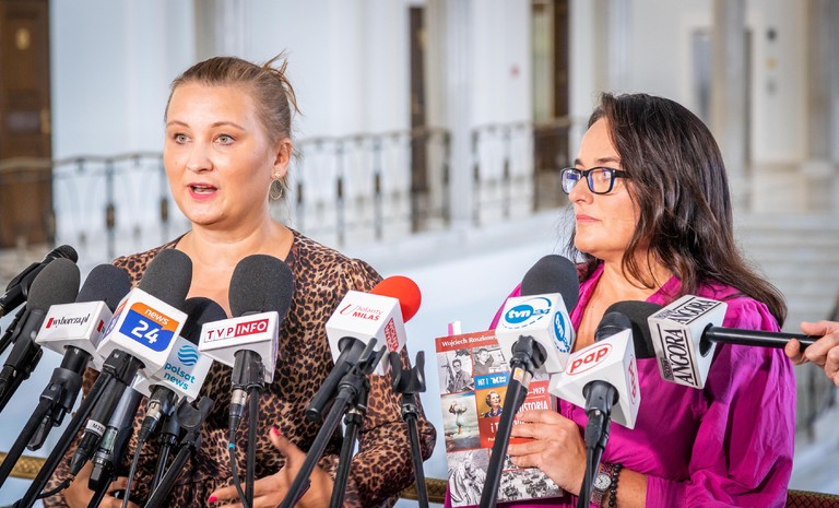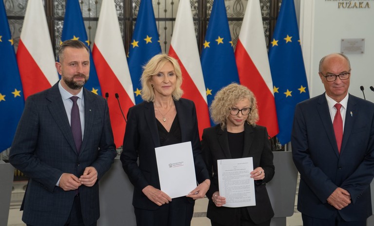 Wicemarszałek Sejmu Włodzimierz Czarzasty i ministra Katarzyna Kotula z Lewicy oraz wicepremier Władysław Kosiniak-Kamysz i posłanka Urszula Pasławska z PSL zaprezentowali projekt ustawy o ...